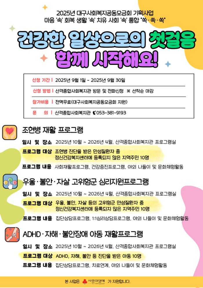 [2025³â ´ë±¸»çȸº¹Áö°øµ¿¸ð±Ýȸ ±âȹ»ç¾÷] 🌿¸¶À½'¼Ó'ȸº¹, »ýȰ'¼Ó' Ä¡À¯, »çȸ'¼Ó'ÅëÇÕ ½ï¡¤½ï¡¤½ï🌿 📢 Âü¿© ´ë»óÀÚ ¸ðÁý ¾È³» »ê°ÝÁ¾ÇÕ»çȸº¹Áö°ü¿¡¼´Â Áö¿ªÁÖ¹ÎÀÇ Á¤½Å°Ç° ÁõÁøÀ» À§ÇØ ´Ù¾çÇÑ ÀçȰ¡¤½É¸®Áö¿ø ÇÁ·Î±×·¥À» ¿î¿µÇÕ´Ï´Ù. ¸¹Àº °ü½É°ú Âü¿© ºÎʵ右´Ï´Ù💚 🔹 ½Åû ±â°£: 2025³â 9¿ù 1ÀÏ ~ 9¿ù 30ÀÏ (¼±Âø¼ø ¸¶°¨) 🔹 ½Åû ¹æ¹ý: »ê°ÝÁ¾ÇÕ»çȸº¹Áö°ü ¹æ¹® ¶Ç´Â ÀüÈ ½Åû 🔹 Âü°¡ ºñ¿ë: ¹«·á (´ë±¸»çȸº¹Áö°øµ¿¸ð±Ýȸ Áö¿ø) 📌 ¸ðÁý ÇÁ·Î±×·¥ ❗Á¶Çöº´ ÀçȰ ÇÁ·Î±×·¥ - ÀϽà ¹× Àå¼Ò : 2025³â 10¿ù ~ 2026³â 4¿ù, »ê°ÝÁ¾ÇÕ»çȸº¹Áö°ü - ´ë»ó: Á¶Çöº´ Áø´ÜÀ» ¹ÞÀº ¸¸¼ºÁúȯÀÚ Áß Á¤½Å°Ç°º¹Áö¼¾ÅÍ ¹Ìµî·Ï Áö¿ªÁֹΠ10¸í - ³»¿ë: »çȸÀçȰÇÁ·Î±×·¥, °Ç°ÁõÁøÇÁ·Î±×·¥, ¾ß¿Ü ³ªµéÀÌ¡¤¹®ÈüÇè ❗¿ì¿ï¡¤ºÒ¾È¡¤ÀÚ»ì °íÀ§Ç豺 ½É¸®Áö¿ø ÇÁ·Î±×·¥ - ÀϽà ¹× Àå¼Ò : 2025³â 10¿ù ~ 2026³â 4¿ù, »ê°ÝÁ¾ÇÕ»çȸº¹Áö°ü - ´ë»ó: ¿ì¿ï¡¤ºÒ¾È¡¤ÀÚ»ì À§Çè µîÀÇ °íÀ§Ç豺 Áß Á¤½Å°Ç°º¹Áö¼¾ÅÍ ¹Ìµî·Ï Áö¿ªÁֹΠ10¸í - ³»¿ë: Áý´Ü»ó´ãÇÁ·Î±×·¥, 1:1½É¸®»ó´ã, ¾ß¿Ü ³ªµéÀÌ¡¤¹®ÈüÇè ❗ADHD¡¤ÀÚÇØ¡¤ºÒ¾ÈÀå¾Ö ¾Æµ¿ ÀçȰ ÇÁ·Î±×·¥ - ÀϽà ¹× Àå¼Ò : 2025³â 10¿ù ~ 2026³â 4¿ù, »ê°ÝÁ¾ÇÕ»çȸº¹Áö°ü - ´ë»ó: ADHD¡¤ÀÚÇØ¡¤ºÒ¾È µî Áø´ÜÀ» ¹ÞÀº ¾Æµ¿ 10¸í - ³»¿ë: Áý´Ü»ó´ãÇÁ·Î±×·¥, Ä¡·á¿¬°è, ¾ß¿Ü ³ªµéÀÌ¡¤¹®ÈüÇè 👉 °Ç°ÇÑ ÀÏ»óÀ¸·ÎÀÇ Ã¹°ÉÀ½ »ê°ÝÁ¾ÇÕ»çȸº¹Áö°ü°ú ÇÔ²² ½ÃÀÛÇØ¿ä Æí¾ÈÇÏ°Ô ¾ðÁ¦µç ¿¬¶ô ÁֽʽÿÀ〰💙 ¢Ï »ê°ÝÁ¾ÇÕ»çȸº¹Áö°ü 053-381-9193 ±è¿¬ÁÖ ¼±ÀÓ»çȸº¹Áö»ç, ¼Õ¼º¹Î »çȸº¹Áö»ç |