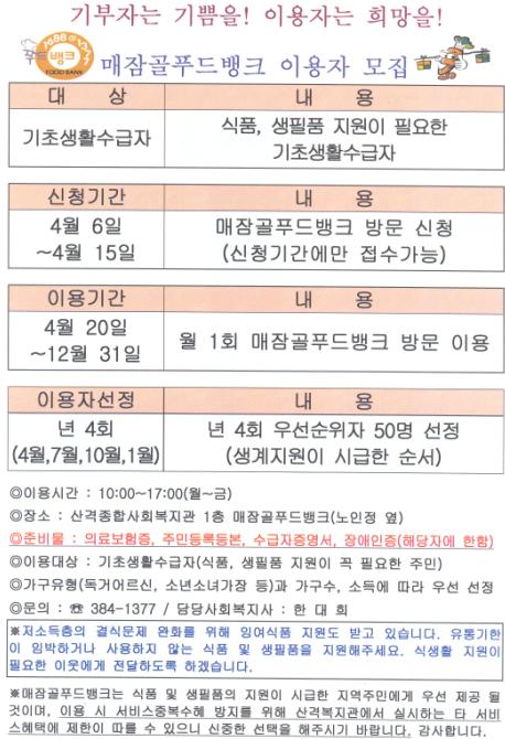 ¡Ø¸ÅÀá°ñǪµå¹ðÅ©´Â ½Äǰ ¹× »ýÇÊǰÀÇ Áö¿øÀÌ ½Ã±ÞÇÑ Áö¿ªÁֹο¡°Ô ¿ì¼± Á¦°ø µÉ °ÍÀ̸ç, ÀÌ¿ë ½Ã ¼ºñ½ºÁߺ¹¼öÇý ¹æÁö¸¦ À§ÇØ »ê°Ýº¹Áö°ü¿¡¼ ½Ç½ÃÇϴ Ÿ ¼ºñ½ºÇýÅÿ¡ Á¦ÇÑÀÌ µû¸¦ ¼ö ÀÖÀ¸´Ï ½ÅÁßÇÑ ¼±ÅÃÀ» ÇØÁֽñ⠹ٶø´Ï´Ù. °¨»çÇÕ´Ï´Ù.