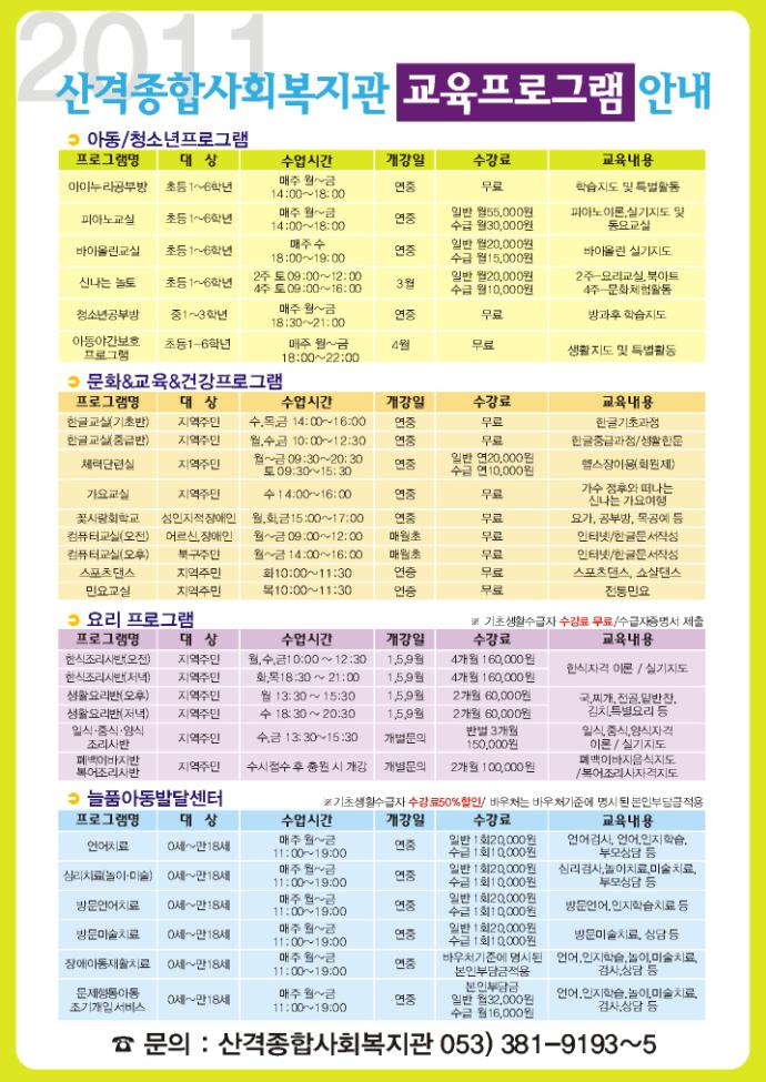¾È³çÇϼ¼¿ä? °³³ª¸®, ¸ñ·ÃÀÌ ¿¹»Ú°Ô ÇÉ µû¶æÇÑ º½ÀÌ ¿Ô½À´Ï´Ù. ^^ »ê°ÝÁ¾ÇÕ»çȸº¹Áö°ü¿¡¼´Â 2011 »çȸ±³À°ÇÁ·Î±×·¥ ¼ö°»ýÀ» ¸ðÁýÇÕ´Ï´Ù. À§ÀÇ Ã·ºÎÆÄÀÏÀ» ´Ù¿î¹Þ¾Æ È®ÀÎÇϽðí Èñ¸ÁÇÏ´Â ÇÁ·Î±×·¥ÀÌ ÀÖÀ¸½Ç °æ¿ì ÀüÈÁֽøé Ä£ÀýÈ÷ ¾È³»Çص帮°Ú½À´Ï´Ù. * ÇÁ·Î±×·¥ : ÷ºÎÆÄÀÏ Âü°í(´Ù¿î·Îµå¸¦ Ŭ¸¯ÇØ¾ß ±Û¾¾°¡ Å©°Ô º¸ÀÔ´Ï´Ù) * ¸ðÁý±â°£ : ¿¬ Áß * ¹® ÀÇ : »ê°ÝÁ¾ÇÕ»çȸº¹Áö°ü ¢Ï 381-9193~5